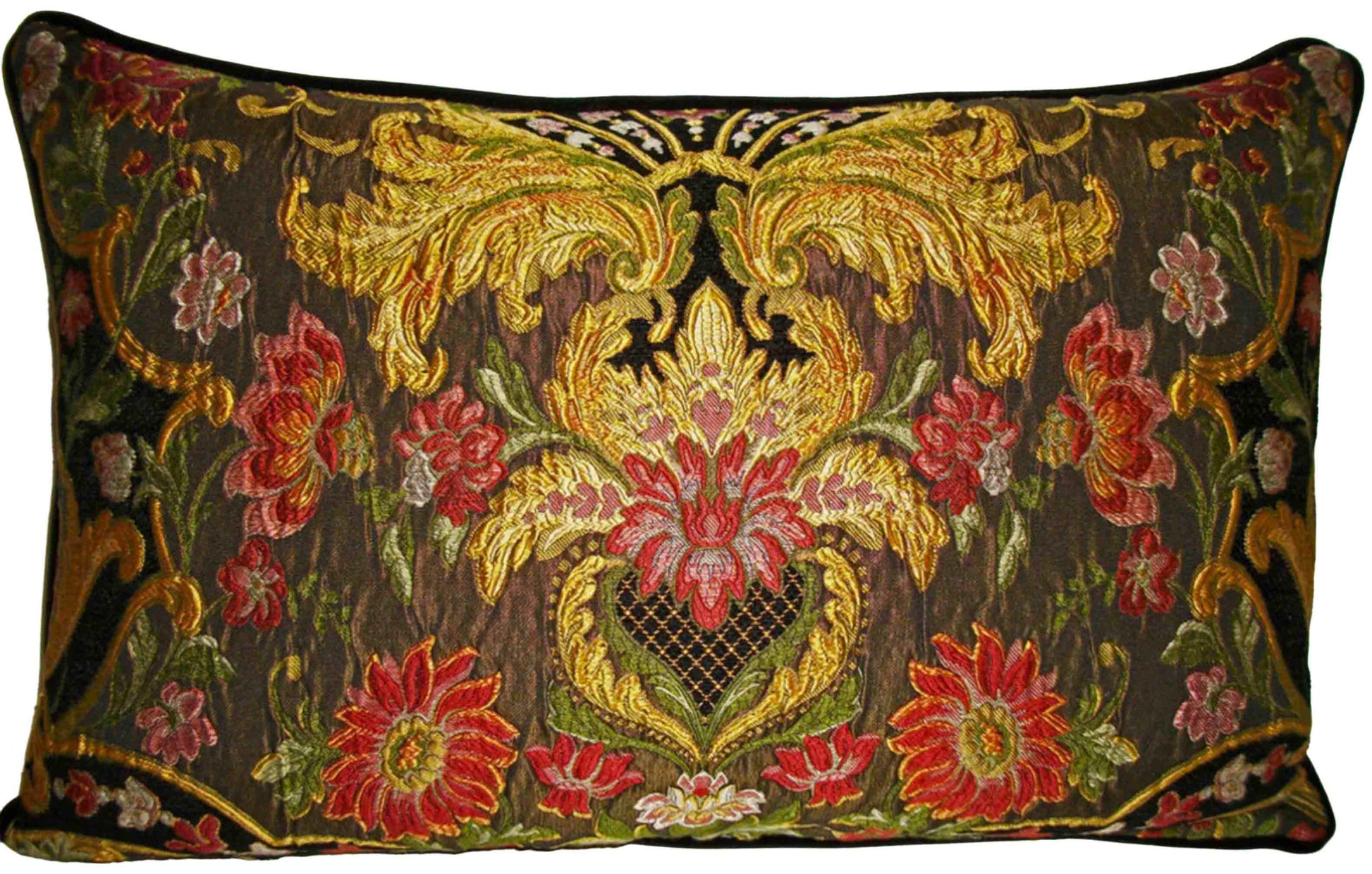 This Embroidered Aubusson Lampas Lumbar Pillow features intricate embroidery on a luxurious front, paired with solid black velvet fabric on the back for a refined contrast. Measuring 24" x 16", it includes a down feather insert for plush comfort and a zipper closure for easy care. Ideal for adding sophisticated texture and support to any seating area. ETA: 1-2 weeks.